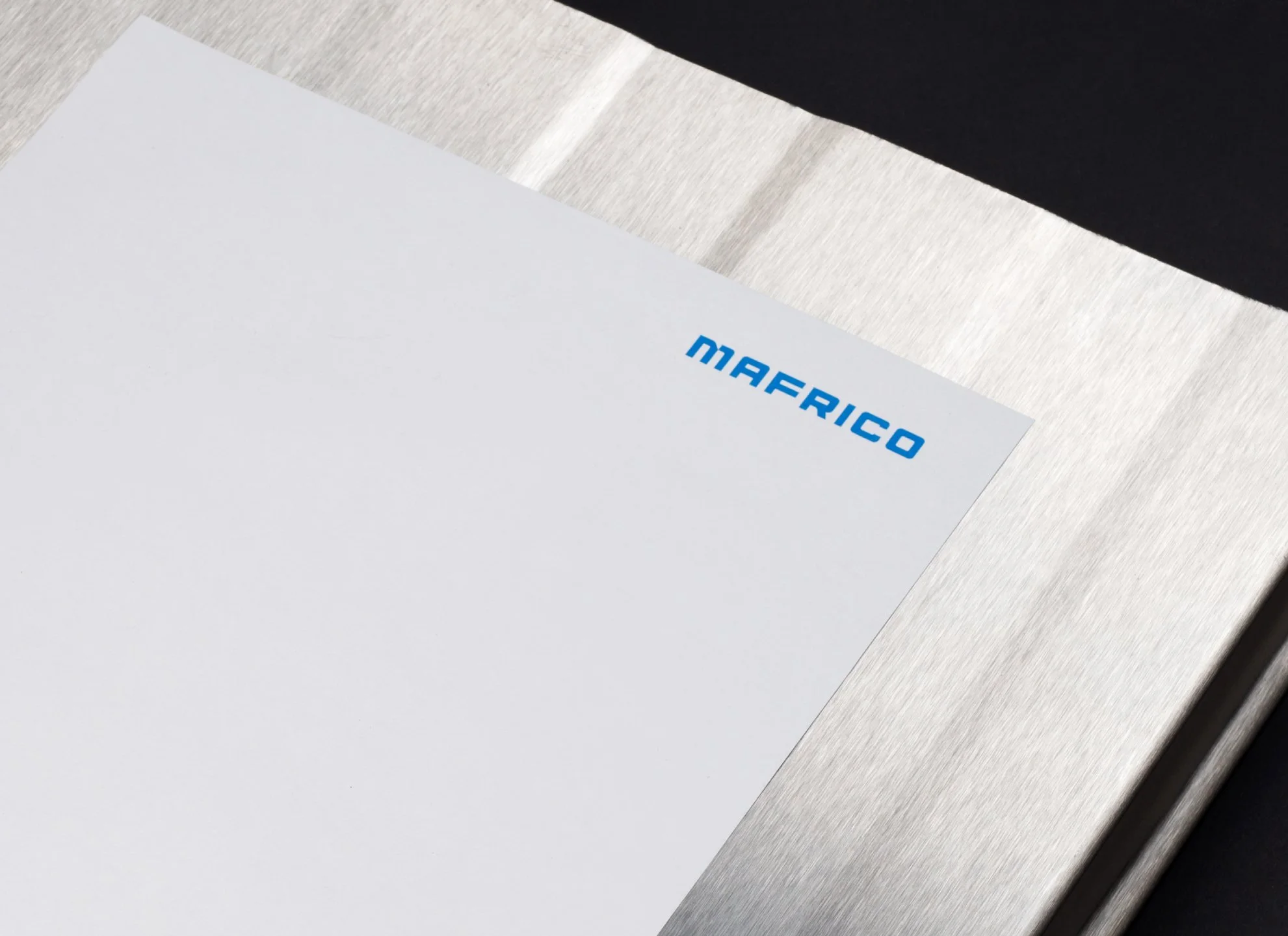 Rediseño de identidad visual para Mafrico. Las formas del logo y el acabado metálico se inspiran en los paneles de aislamiento termico.